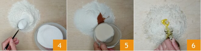 Forme um monte com a farinha e adicione o açúcar 4 e a canela em pó, despeje o fermento dissolvido em água 5 e comece a amassar para misturar os ingredientes. Incorpore também o azeite de oliva 6.