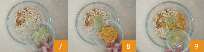 Em uma tigela, coloque as frutas secas (os pinhões, as amêndoas, as avelãs e as nozes), o cedro cristalizado 7, a laranja cristalizada 8, as claras de ovo 9 e misture com uma colher.