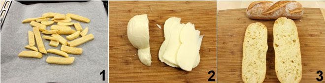 Para preparar o sanduíche de salsicha e batatas, comece forrando uma assadeira com papel manteiga, coloque as batatas 1 e asse por cerca de 15 minutos a 200°C, quando estiverem prontas, adicione sal. Enquanto isso, corte o queijo provolone em fatias bem finas 2 e o pão ao meio no sentido do comprimento 3,