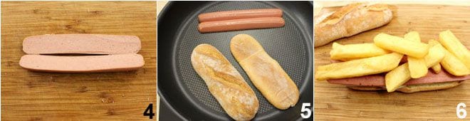 corte também a salsicha no sentido do comprimento 4. Aqueça então uma frigideira antiaderente e coloque o pão (com a parte cortada voltada para baixo) e a salsicha 5. Cozinhe por cerca de 5 minutos, virando a salsicha na metade do tempo de cozimento. Comece então a montar o sanduíche: cubra o pão com as fatias de queijo provolone que derreterão em contato com o pão quente, adicione a salsicha e disponha as batatas por cima 6, espalhe ketchup ou maionese (o que você preferir) e feche com a outra metade do pão.