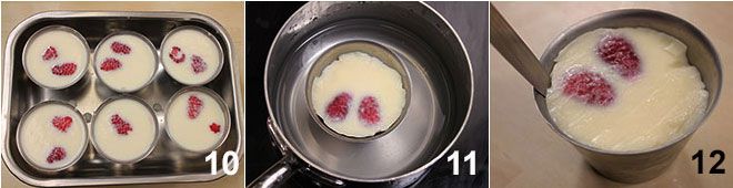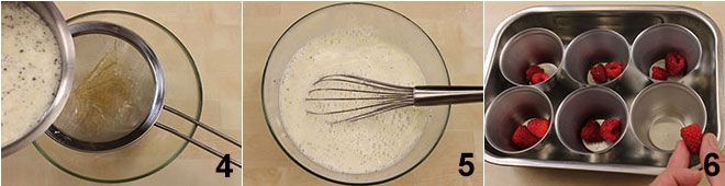 Quando o creme de leite atingir a temperatura, retire a panela do fogo, coe o creme quente com uma peneira fina para eliminar os pedaços de baunilha e despeje na tigela onde está a gelatina espremida 4. Mexa bem para dissolver a gelatina 5 e, se necessário, leve a mistura novamente ao fogo por alguns minutos. Prepare 6 forminhas com diâmetro de 8 cm e capacidade de cerca de 120 ml e coloque no fundo 2 framboesas, lavadas e secas, 6 e