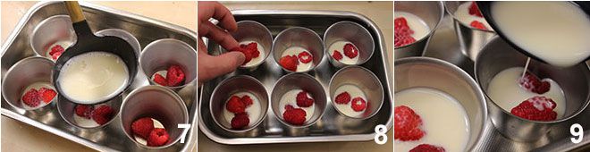 despeje na forminha a primeira camada de panna cotta que cobrirá as framboesas pela metade de sua altura 7. Deixe a primeira camada solidificar na geladeira por cerca de 1 hora ou no freezer por 30 minutos; enquanto isso, cubra a mistura restante com uma camada de filme plástico, fazendo um pequeno furo na superfície para que o ar possa passar e mantenha à temperatura ambiente, longe de fontes de calor, mexendo com o batedor de vez em quando. Após o tempo indicado, coloque mais duas framboesas dentro da forminha 8 e cubra com a segunda camada de panna cotta 9.