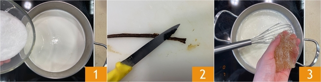 Para preparar a panna cotta com coulis de pêssegos, a primeira coisa a fazer é colocar a gelatina em folhas para hidratar. Em uma panela, despeje o creme de leite fresco, adicione o açúcar 1, as sementes de baunilha 2 e leve à fervura. Desligue o fogo e adicione a gelatina bem espremida 3.
