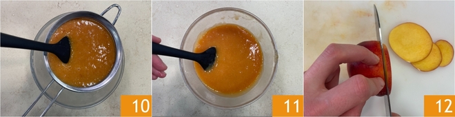 Passe tudo por uma peneira 10 para obter um coulis cremoso 11, depois deixe repousar na geladeira até o momento de usar. Corte os pêssegos em fatias com espessura de cerca de 5 mm 12.