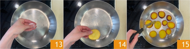 Espalhe o açúcar no fundo de uma frigideira 13, coloque sobre ele as fatias de pêssego 14 e caramelize dos dois lados, em fogo médio, por 3 minutos 15.