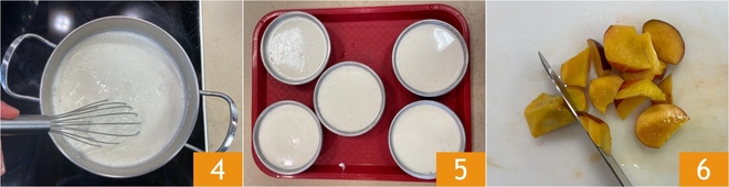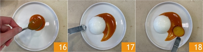 Para montar o prato, coloque no fundo o coulis de pêssegos 16, sobreponha a panna cotta 17 e finalize com uma fatia de pêssego caramelizado 18. Sua panna cotta com coulis de pêssegos está pronta para ser saboreada!