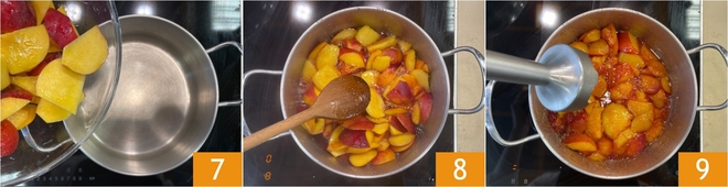 Coloque-os em uma panela 7, adicione o açúcar, a água e cozinhe, em fogo alto, por 10 minutos ou até que os pêssegos estejam bem macios 8. Bata com um mixer de imersão 9.