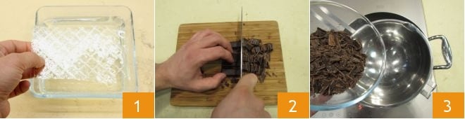 Para preparar a panna cotta de chocolate, comece com a gelatina em folhas: coloque as folhas de gelatina em uma tigela com água fria por pelo menos 10 minutos 1; enquanto isso, você pode picar o chocolate amargo em uma tábua de corte com uma faca 2; uma vez picado, deixe-o derreter em banho-maria 3.
