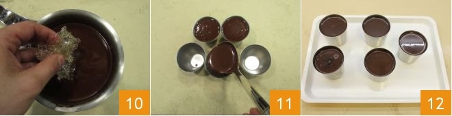 Esprema a gelatina em folhas, que agora estará amolecida, e insira-a na mistura ainda quente 10 e misture bem, para que não se formem grumos. Disponha os pequenos moldes de panna cotta com capacidade de cerca de 100 ml cada e despeje a mistura 11. Depois de esfriar à temperatura ambiente, coloque os moldes em uma bandeja 12 ou prato e deixe na geladeira por pelo menos 4 horas.