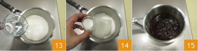 Para preparar o caramelo com manteiga salgada, basta colocar o açúcar em uma panela junto com a água 13 e o sal 14. Não use nenhum utensílio para mexer, apenas gire a panela e deixe os ingredientes derreterem bem 15.