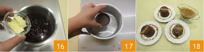 Quando o caramelo estiver dourado, mergulhe a panela em água fria para interromper o cozimento, coloque a panela em uma superfície e adicione a manteiga, mexendo até ser completamente absorvida 16. Após o tempo de resfriamento, retire as panna cottas dos moldes: para facilitar, você pode mergulhar os moldes em água fervente por alguns instantes 17; depois, passe a lâmina de uma faquinha em volta da borda e vire para desenformar. Decore então a panna cotta de chocolate com granulado de avelã e despeje com uma colher um pouco de caramelo salgado no prato e na sobremesa 18. A panna cotta de chocolate e avelãs com caramelo salgado está pronta para ser servida.
