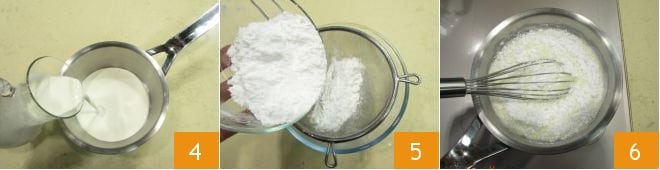 Em uma panela, despeje o creme de leite 4 e deixe aquecer; à parte, peneire o açúcar de confeiteiro 5 e adicione-o misturando com um batedor 6 para incorporá-lo bem (você também pode peneirá-lo diretamente na panela).