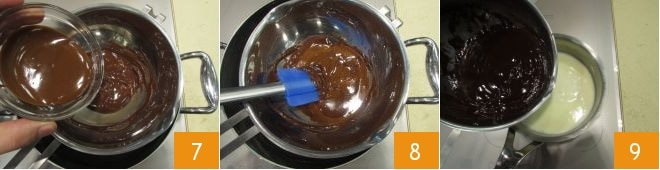 Fique de olho no chocolate que está derretendo e, assim que estiver bem derretido, sem grumos, adicione a pasta de avelã 7 e misture bem 8; assim que o chocolate e a pasta de avelã estiverem bem incorporados, despeje sobre o creme quente 9.