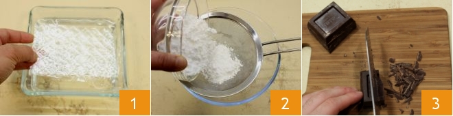 Para preparar a panna cotta de chocolate, comece pela panna cotta: coloque as folhas de gelatina de molho em uma tigela com água fria 1, por pelo menos 10 minutos. Peneire o açúcar de confeiteiro 2 e pique o chocolate amargo 3.