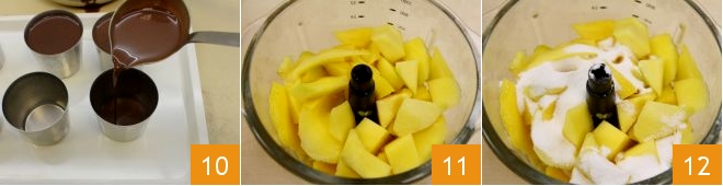 Desligue o fogo e despeje a mistura dividindo-a em 5 forminhas 10 e deixe-as firmar na geladeira por pelo menos 4 horas. Prepare o molhinho de manga cortando uma manga madura em pedaços 11 e triturando-a muito finamente em um mixer com açúcar e limão 12. Extraia duas colheres de sopa de purê, aqueça bem no micro-ondas e incorpore três gramas de gelatina que você previamente amoleceu em água fria e depois espremida. Adicione tudo ao restante do coulis e deixe esfriar por pelo menos 2 horas na geladeira.