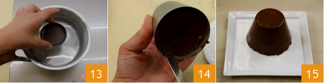 Após o tempo de resfriamento, retire as pannacottes das forminhas: para facilitar a operação, você pode mergulhar as forminhas em água fervente por alguns instantes 13; então passe a lâmina de uma faquinha ao redor da borda 14, inverta para desenformar 15. Decore então a panna cotta de chocolate com o molhinho de manga, folhinhas de hortelã e eventualmente manga em cubos.
