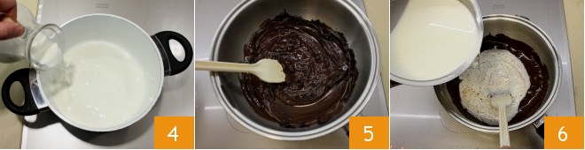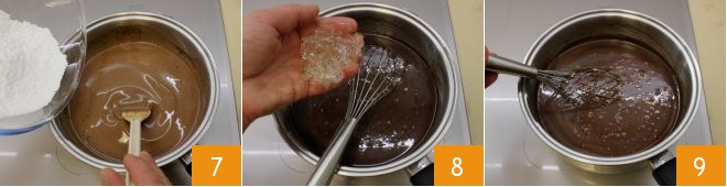 e o açúcar de confeiteiro peneirado 7. Continue mexendo com uma espátula e aqueça tudo em fogo baixo sem nunca deixar ferver e continue mexendo para que o chocolate não forme grumos. Esprema bem as folhas de gelatina e adicione-as à mistura 8, depois misture com um batedor até que estejam completamente dissolvidas 9.