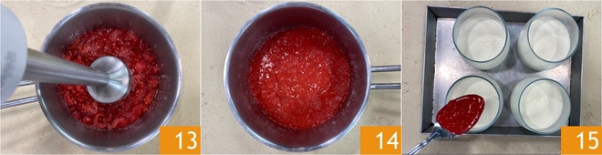 Desligue o fogo e bata com um mixer de imersão 13 para obter uma consistência homogênea 14. Retire os copinhos da geladeira e distribua o coulis de framboesa na superfície 15.