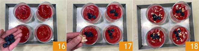 Decore com framboesas e mirtilos frescos 16, depois finalize com amêndoas trituradas 17. Sua panna cotta vegana está pronta para ser saboreada 18!
