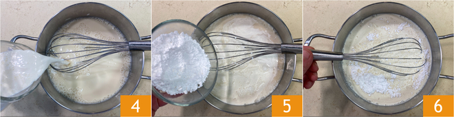 Adicione também o creme vegetal 4 e o açúcar de confeiteiro peneirado 5. Misture bem com o batedor 6.
