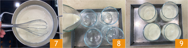 Leve a panelinha ao fogo e cozinhe em fogo médio-baixo até começar a ferver levemente, mexendo sempre para evitar que grude 7. Deixe ferver por cerca de 3 minutos, depois desligue o fogo e despeje a mistura ainda quente em 4 copinhos; cada copinho deve conter cerca de 250 g de panna cotta 8. Deixe esfriar em temperatura ambiente 9, depois leve à geladeira por pelo menos 5 horas.