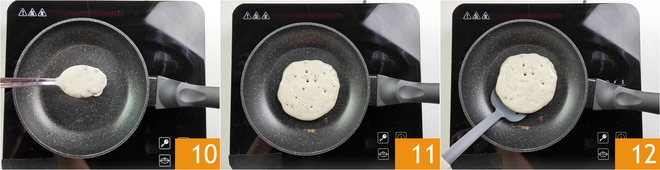 Aqueça à parte uma frigideira antiaderente de diâmetro de 20 cm e, quando estiver bem quente, despeje 1 ou 2 colheres de sopa de massa 10 de forma a formar uma panqueca de aproximadamente 8 cm de diâmetro 11. Assim que as bolhas começarem a se formar, vire a panqueca com uma espátula 12.