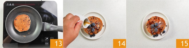 Continue cozinhando do outro lado também 13. Continue dessa forma até terminar todos os ingredientes; com essas quantidades renderão 10. Sirva as panquecas com iogurte ainda quentes, guarnecidas com xarope de bordo ou mel 14 15.