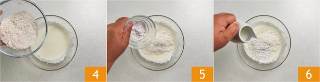 Adicione também a farinha 4, o fermento em pó peneirado 5 e o leite 6.