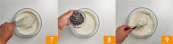 Misture novamente até obter uma massa homogênea e sem grumos 7. Por fim, adicione as gotas de chocolate 8 e incorpore-as na massa 9.