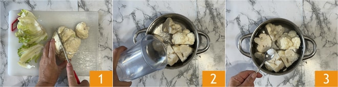 Para preparar a panqueca de couve-flor, corte a couve-flor em floretes, removendo as folhas externas 1. Coloque em uma panela, cubra com água 2 e adicione sal 3.