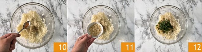 Tempere o purê com sal, pimenta, noz-moscada 10, depois adicione os pinolis 11 e a salsa 12.