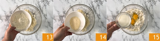 Adicione a farinha 13, o queijo ralado 14 e o fermento e misture. Incorpore também os ovos e o leite 15.