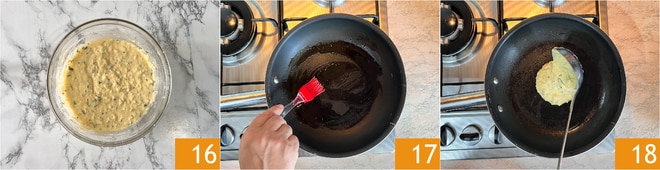 Misture para incorporar bem 16. Unte uma frigideira 17 e aqueça-a. Despeje uma pequena concha da mistura para cada panqueca 18.