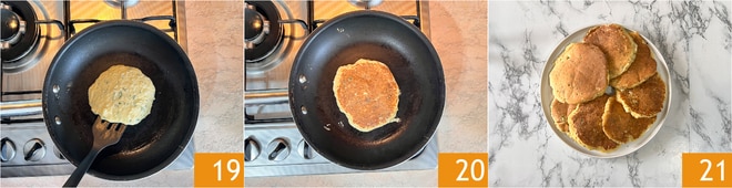 Deixe cozinhar por alguns minutos e, com uma espátula, vire-os 19 e deixe cozinhar do outro lado 20. Quando estiverem dourados, transfira as panquecas de couve-flor para um prato de servir 21.