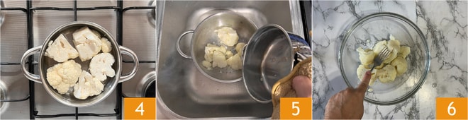 Cozinhe por 15 minutos 4. Quando estiver macia, escorra 5 a couve-flor (o peso dela será de cerca de 360 g), coloque-a em uma tigela e, ainda quente, amasse com um garfo 6.