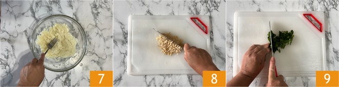 Após obter um purê 7, reserve. Pique os pinolis 8 e a salsa 9.