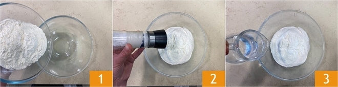 Para preparar as panquecas chinesas com cebolinha, comece pela massa. Em uma tigela, coloque a farinha 1, o sal 2 e comece a adicionar parte da água 3.