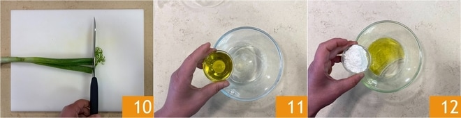 Neste ponto, pique a parte verde de uma cebolinha 10 e reserve. Depois, prepare a emulsão. Em uma tigela, coloque a água, o óleo 11 e a farinha 12.
