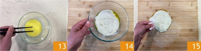 Misture sempre com os pauzinhos 13 ou com um garfo, até obter uma mistura homogênea. Pegue a massa descansada 14 e transfira-a para uma superfície levemente enfarinhada; enfarinhe também a superfície 15.