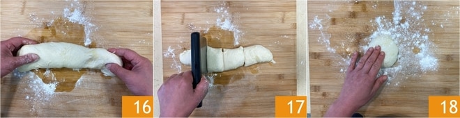 Forme um cilindro 16 e divida-o em 4 partes iguais 17. Pegue a primeira porção e achate-a com as mãos 18.