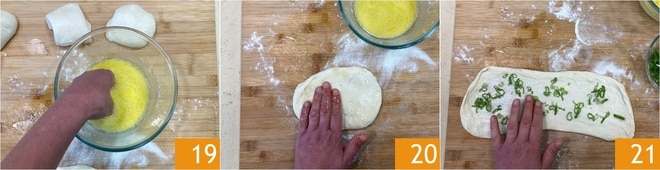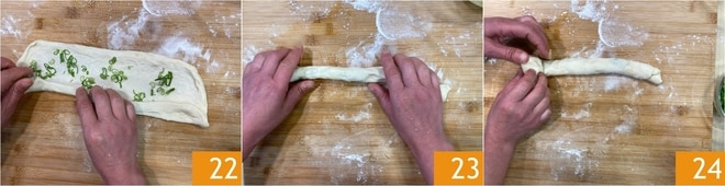 Umedeça as mãos na emulsão 19 e pressione novamente a massa 20 até obter um retângulo fino. Polvilhe com a cebolinha 21.