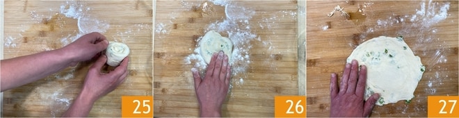 Você deve formar uma espiral 25. Pressione-a delicadamente com as mãos 26, adicionando farinha conforme necessário. Você deve obter um disco fino 27.