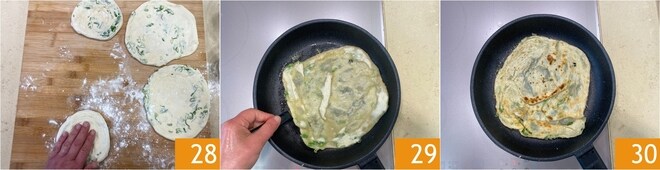 Continue desta maneira até formar todas as 4 panquecas 28. Agora, passe para a cocção, aqueça uma frigideira ligeiramente maior com um fio de óleo. Insira a primeira panqueca dentro 29, pincele-a com a emulsão e cozinhe até ficar bem dourada. Então, vire-a 30.