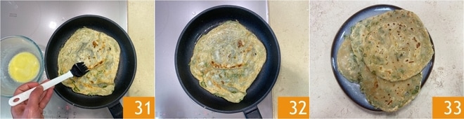 Pincele-a novamente com a emulsão preparada anteriormente 31 e continue a cocção 32. Cozinhe as outras e sirva suas panquecas chinesas 33.