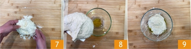 Não se preocupe se ela ficar muito pegajosa, é normal. Trabalhe-a com as mãos por 10-15 minutos 7; se ficar complicado, ajude-se com um raspador. Transfira a massa para uma tigela untada 8. Cubra com filme plástico 9 e deixe descansar por 30 minutos.