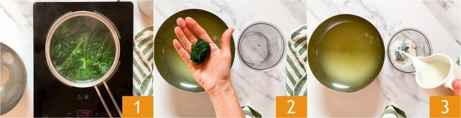 Para preparar as crepes com abóbora, speck e nozes, comece pela massa. Cozinhe os espinafres em pouca água fervente salgada por 3 minutos 1, depois escorra-os e coloque-os em água com gelo. Escorra-os, transfira para o copo de um liquidificador e bata com o leite 2.