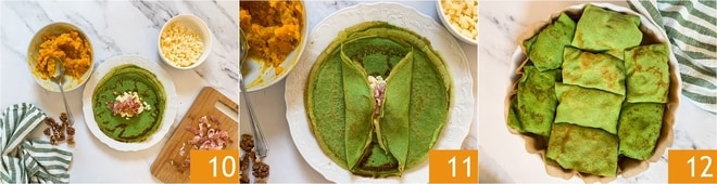 Cozinhe as crepes untando levemente a frigideira antiaderente. Vire-as apenas uma vez, assim que desgrudarem da frigideira. Agora monte: coloque em cada crepe uma colher de sopa de creme de abóbora, um pouco de speck, as nozes grosseiramente picadas e a muçarela cortada em cubos 10. Dobre duas bordas para dentro 11 e enrole. Transfira as crepes para uma assadeira forrada com papel manteiga e asse por 10/12 minutos em forno estático pré-aquecido a 180°.