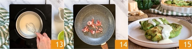Enquanto isso, prepare o fondue com o queijo ralado e o leite. Cozinhe em fogo médio por 4 minutos 13, até ficar liso. Em uma frigideira, salteie também o speck restante 14. Retire as crepes verdes do forno, coloque o fondue por cima 15, o speck crocante e alguns pedaços de nozes triturados. Sirva as crepes ainda quentes!