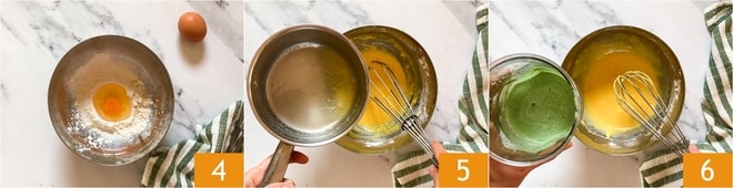 Derreta a manteiga em fogo baixo e deixe esfriar. Peneire a farinha em uma tigela, adicione os ovos 4 e misture bem com um batedor. Adicione a manteiga derretida 5, a mistura de leite e espinafre 6 e o sal. Deixe a massa descansar na geladeira por meia hora.