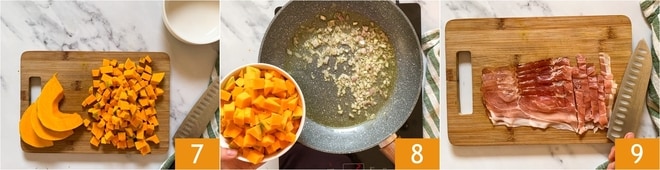 Pique finamente a chalota e corte a abóbora em cubos 7. Refogue a chalota em uma frigideira antiaderente com um fio de azeite. Adicione a abóbora 8, tempere com sal, pimenta e noz-moscada. Deixe cozinhar até que os cubos de abóbora fiquem macios, adicionando algumas colheres de água, se necessário. Quando estiver cozida, amasse com um garfo e reserve. Corte o speck em tiras 9 e reserve um terço.